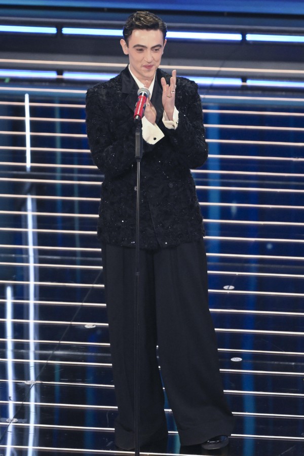 Segue Michele Bravi, che prosegue il sodalizio con Antonio Marras per questo Festival di Sanremo con un completo total black, animato solo da una giacca luccicante.