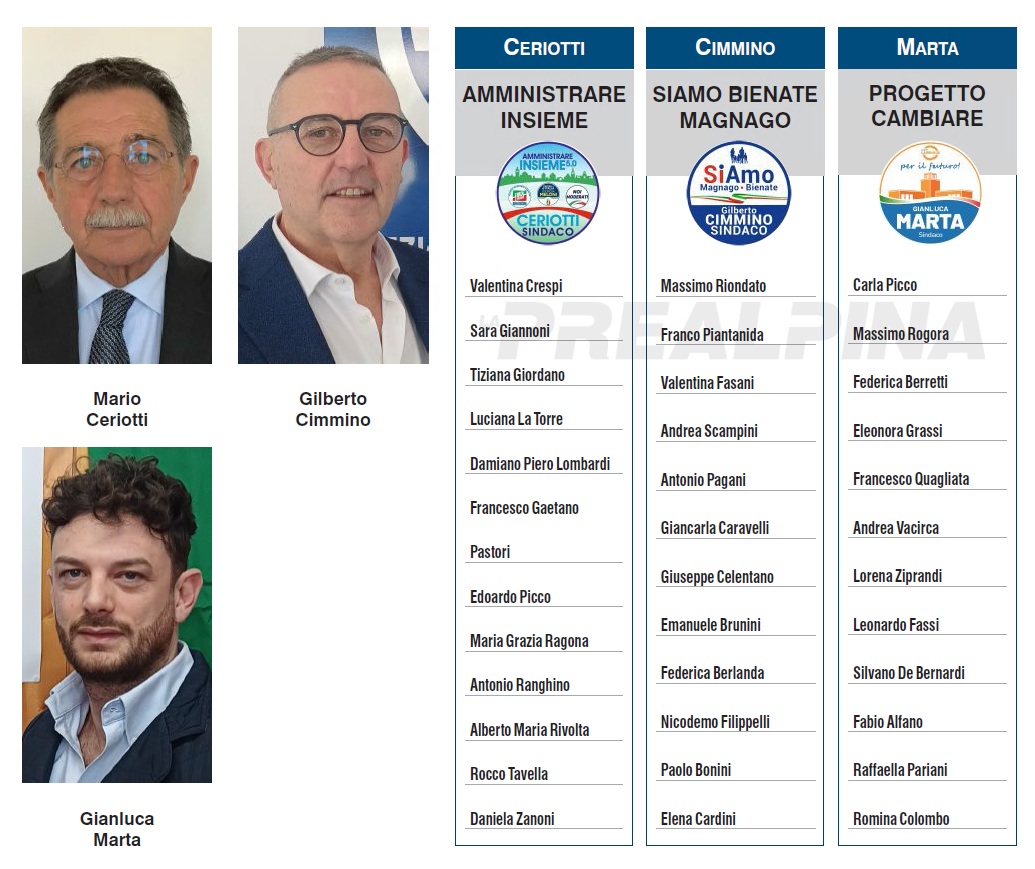 Sono Mario Ceriotti, Gilberto Cimmino e Gianluca Marta, i candidati alle elezioni amministrative 2026 di Magnago. Gli elettori saranno chiamati al voto domenica 24 e lunedì 25 maggio.