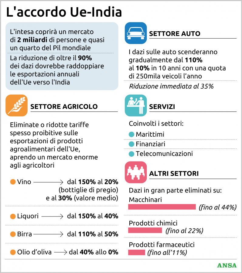 Detto questo, l’FTA rappresenta il piatto forte del banchetto. Le tariffe doganali su oltre il 90% delle esportazioni di merci europee in India saranno eliminate o ridotte, con un risparmio fino a 4 miliardi di euro all’anno sui dazi; ci sarà un vantaggio competitivo per gli esportatori, «con la più grande apertura che l’India abbia mai concesso a un partner», con un accesso privilegiato per i fornitori di servizi in settori chiave come finanzia, servizi marittimi, telecomunicazioni. Il ministro indiano al Commercio, Piyush Goyal, si aspetta passi avanti concreti per l’India nel settore tessile, che oggi gode di esportazioni nell’Ue pari a 7 miliardi. «Possiamo adesso arrivare a 30-35 miliardi, generando 6-7 milioni di posti di lavoro qui da noi». I benefici a ogni modo arriveranno col tempo.